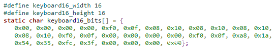 这非常像是一段C代码。这是一种十分古老的格式,在X Windows System中用于存储X GUI所使用的光标和图标的位图。keyboard16_bits数组中每一个值代表了8个像素,每一个像素是一个bit,用于标记是黑色还是白色。因此没有负像素值,因为一个像素值可能有两个值。