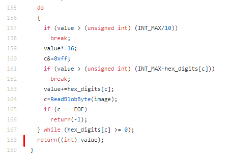 现在让我们着眼于XBMInteger()函数。指针image和指针hex_digits是参数。hex_digits是一个在Line 305被初始化的数组。这用于将XBM主体数组中十六进制值转化为对应的十进制值。XBMInteger读取XBM主体数组中的数据,并将其放入unsigned int变量value。这里存在一个有趣的逻辑,此函数读取十六进制值,直到出现停止标记才停止。这意味着我们可以指定任意长度的十六进制值,因此可以不是char类型原本0-255之间的值,我们可以设置任何unsigned int值,它将存储在变量value中。而下面的处理将变量value将转换为signed int。好了这里就是重头戏了。
