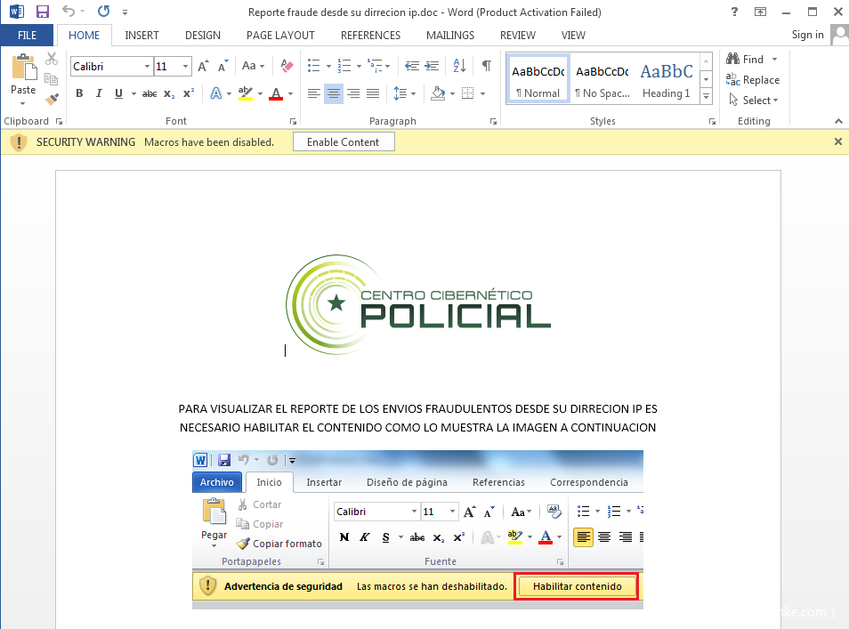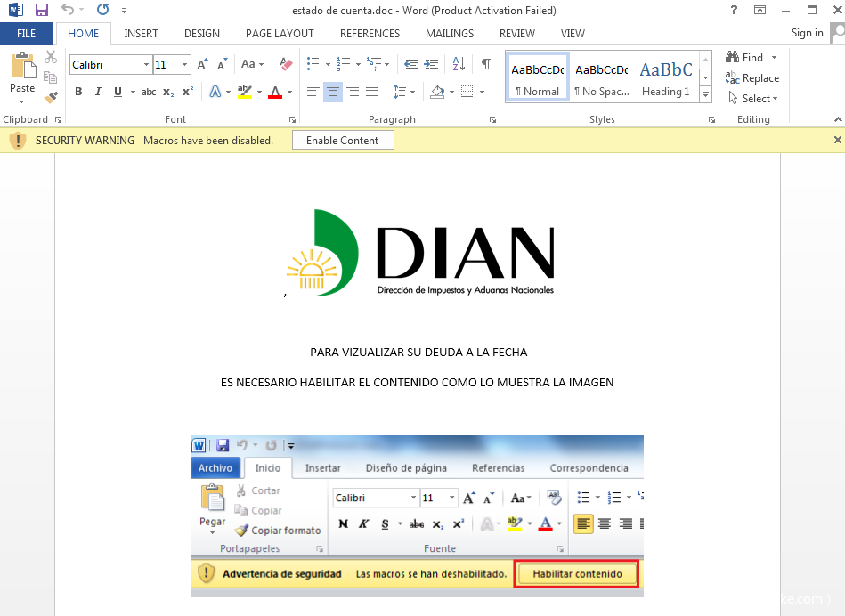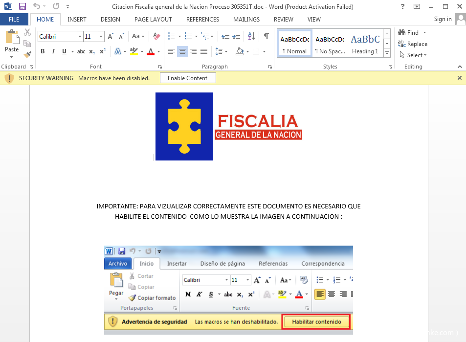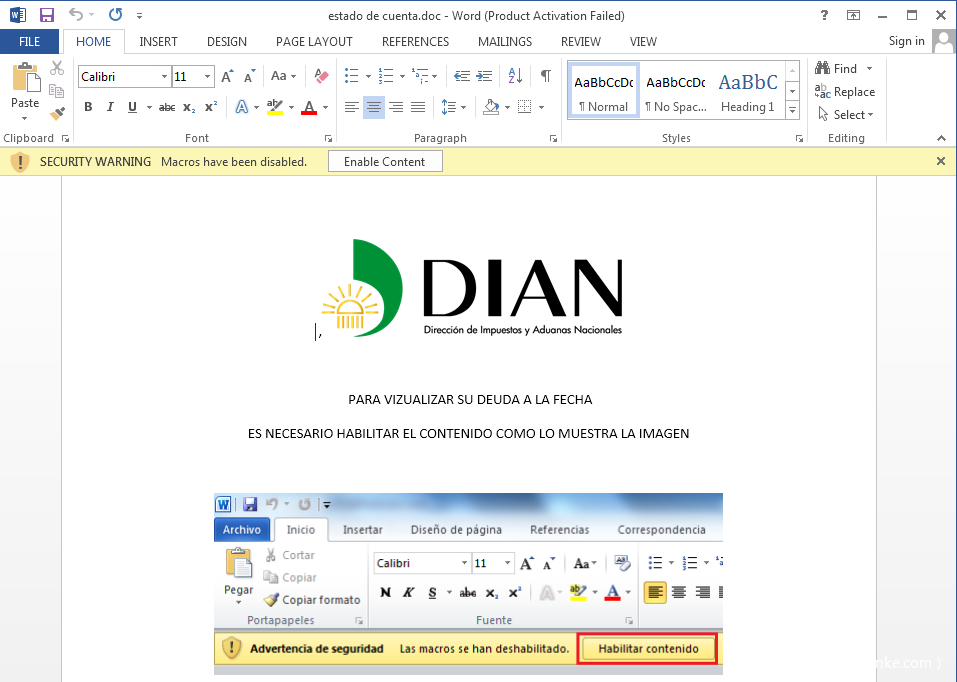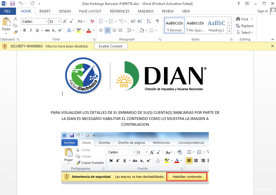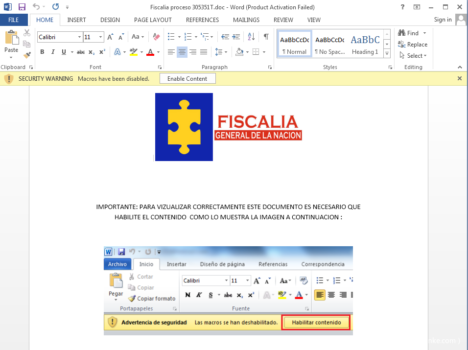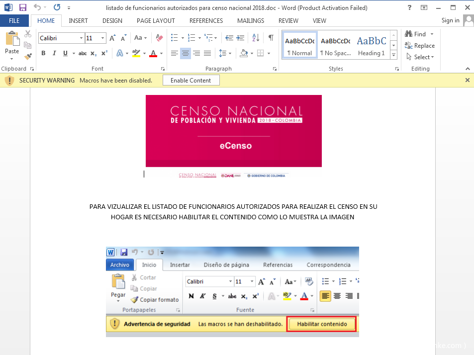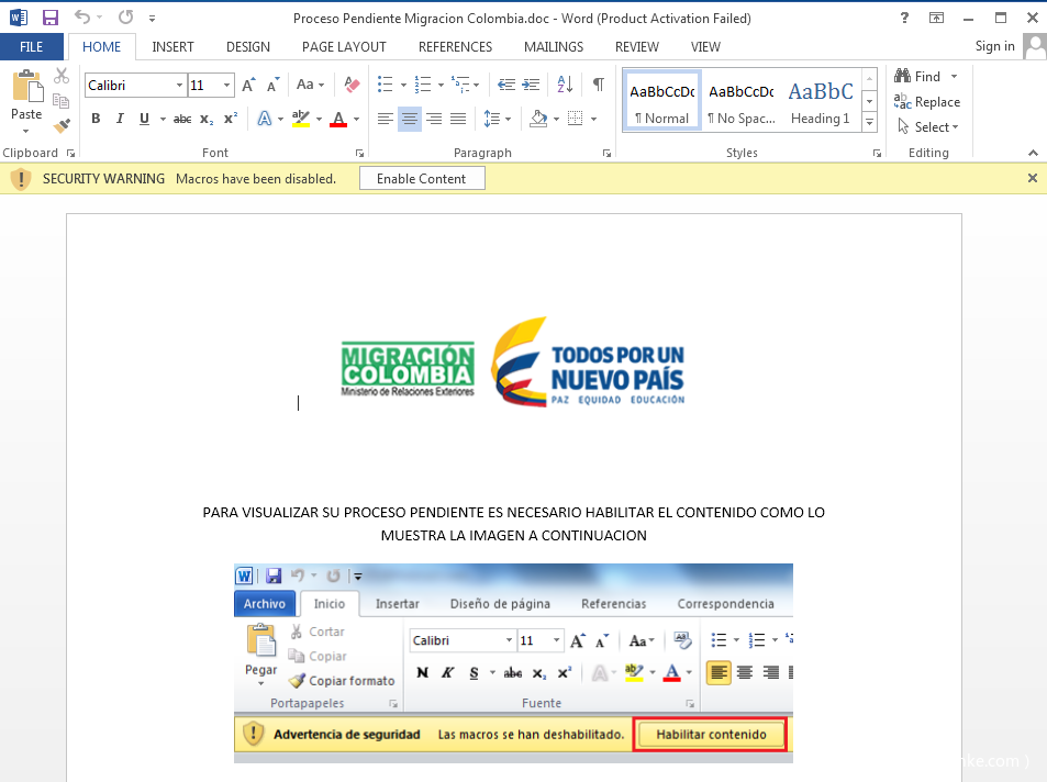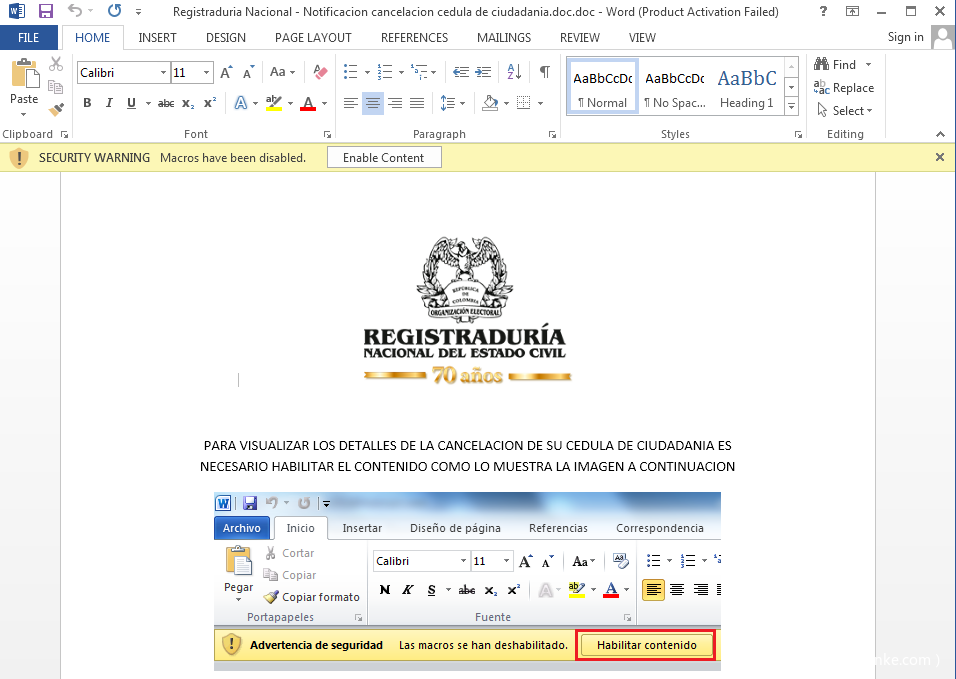 文档伪装成哥伦比亚国家民事登记处,并利用西班牙语提示受害者开启宏代码,从而执行后续Payload