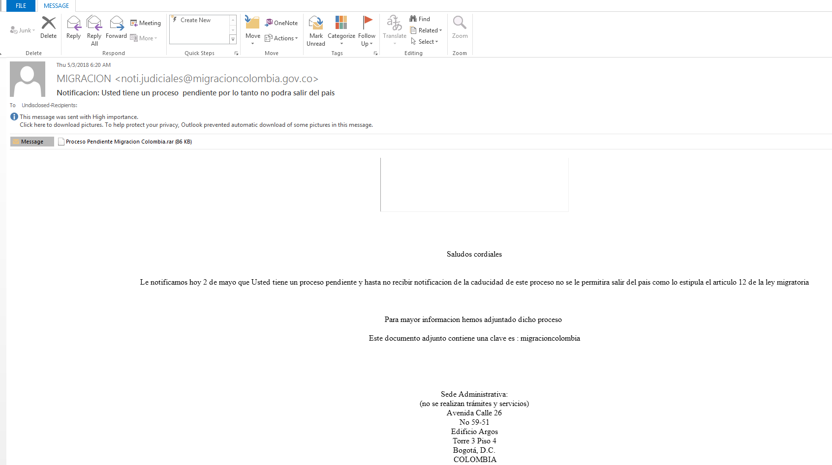 攻击哥伦比亚国家盲人研究所的邮件