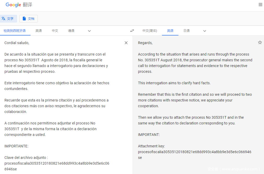 攻击者同样对邮件内容进行精心构造,使其看似源自被伪造的机构,且与被攻击者日常工作生活相关。下图为伪装成哥伦比亚国家司法部门对ATH哥伦比亚分部的攻击中对应邮件的内容翻译: