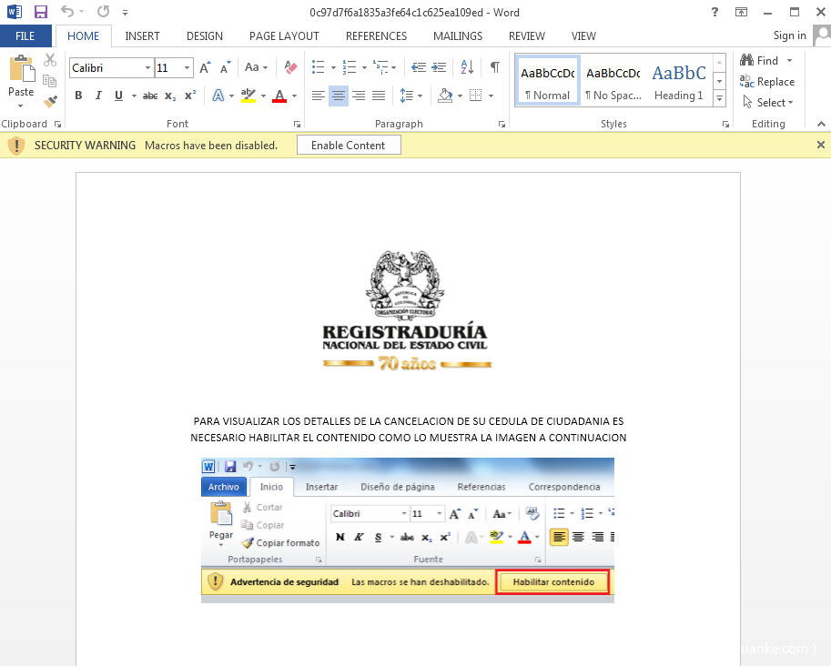 最近捕获的诱饵文档,伪装来自哥伦比亚国家民事登记处(MD5:0c97d7f6a1835a3fe64c1c625ea109ed)