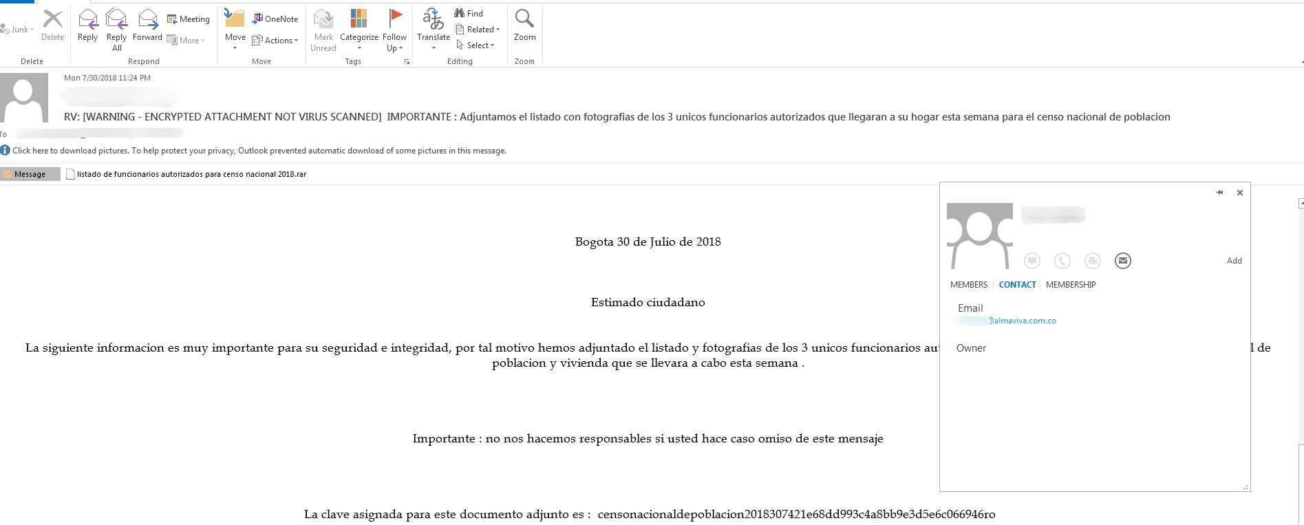 2019年2月14日,360威胁情报中心再次监控到该APT组织的最新攻击活动,根据最近捕获到的诱饵文档(MD5:0c97d7f6a1835a3fe64c1c625ea109ed)并没有找到对应的邮件,不过在进行关联调查后,我们发现了另外一个类似的诱饵文档(MD5:3de286896c8eb68a21a6dcf7dae8ec97)及其对应的有针对性攻击邮件(MD5:f2d5cb747110b43558140c700dbf0e5e)。该邮件伪装来自哥伦比亚国家民事登记处,对哥伦比亚国家盲人研究所进行攻击。