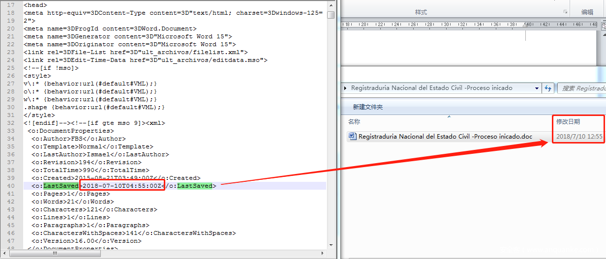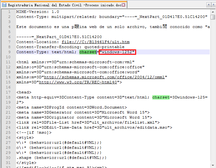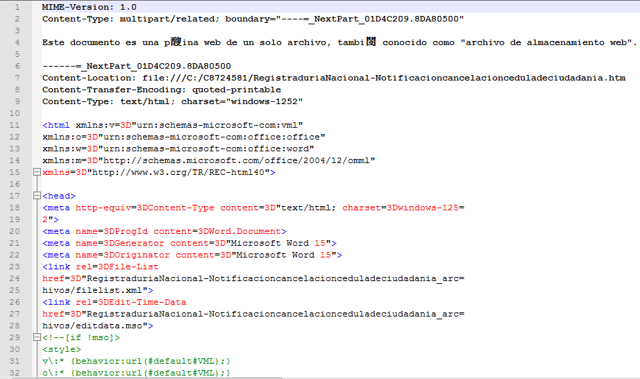 此次攻击活动诱饵文档均采用MHTML格式的Word文档进行攻击,MHTML格式的Word文档能在一定程度上避免杀毒软件的查杀。例如360威胁情报中心在2019年2月中旬捕获的样本:Registraduria Nacional – Notificacion cancelacion cedula de ciudadania.doc