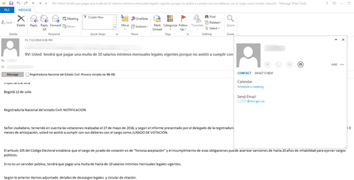 攻击者在攻击不同目标时,仔细考虑了如何伪装邮件的来源从而使其看起来更加可信。比如通过伪装民事登记处来攻击盲人研究所,伪装成税务和海关总署来攻击那些有国际贸易的企业,伪装成司法部门和移民权力机构来针对银行和跨国公司哥伦比亚分部等。