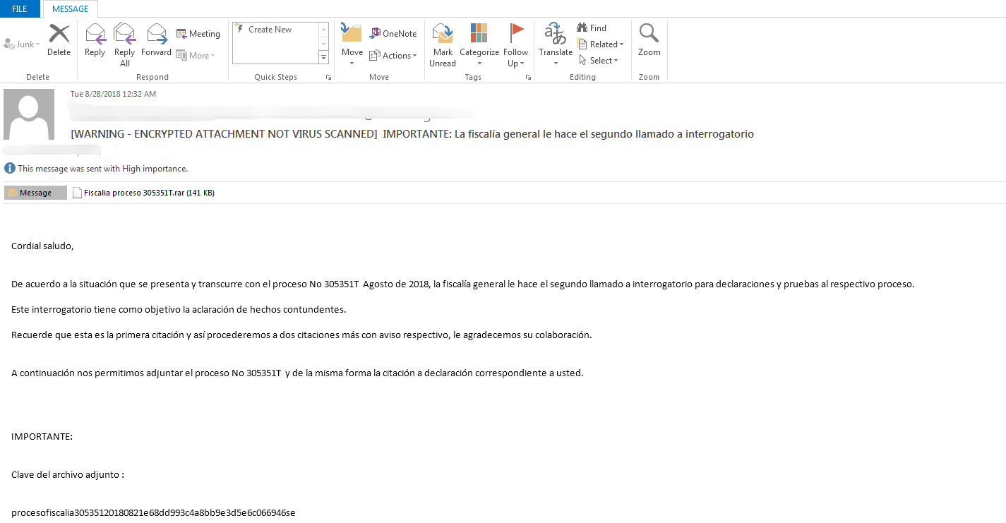 2018年4月,360威胁情报中心捕获到第一个针对哥伦比亚政府的定向攻击样本,在此后近一年时间内,我们又先后捕获了多起针对哥伦比亚政企机构的定向攻击。攻击者习惯将带有恶意宏的MHTML格式的Office Word诱饵文档通过RAR加密后配合鱼叉邮件对目标进行投递,然后将RAR解压密码附带在邮件正文中,具有很好的躲避邮件网关查杀的效果。其最终目的是植入Imminent后门以实现对目标计算机的控制,为接下来的横向移动提供基础。