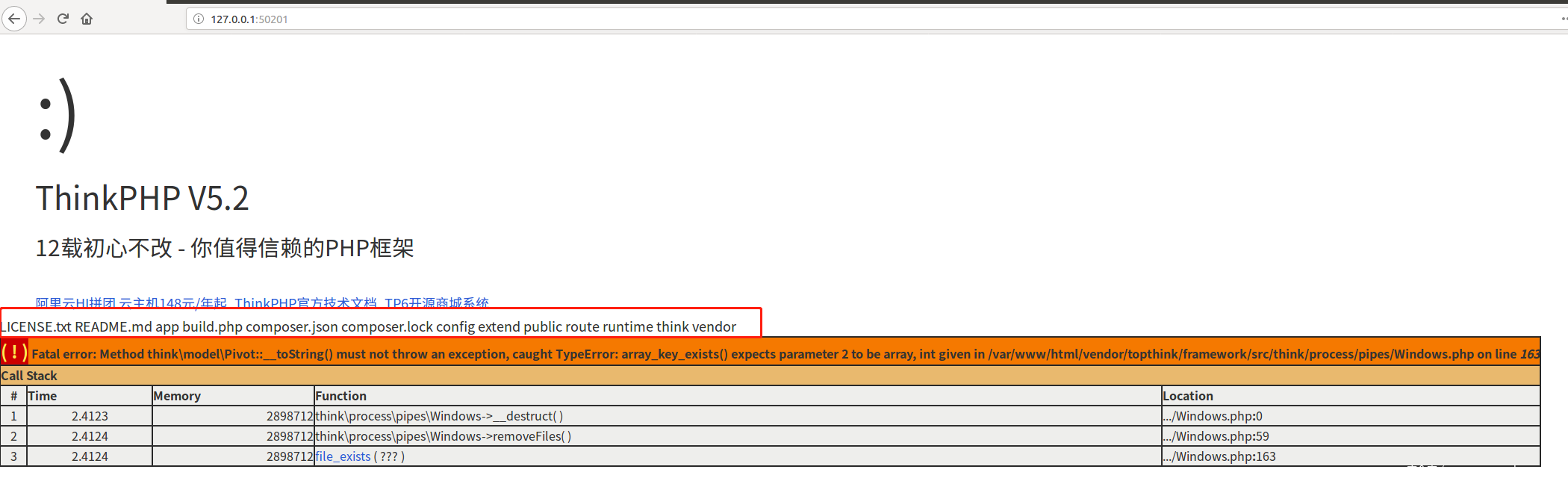 - vendor/topthink/framework/src/think/process/pipes/Windows.php __destruct ->removeFiles ->file_exists 强制转化字符串filename,这里的filename可控 可触发__toString函数,下一步找可利用的__toString