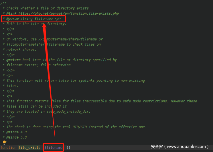 此处使用file_exists来判断$filename是否存在,在file_exists中,$filename会被当作string类型处理。