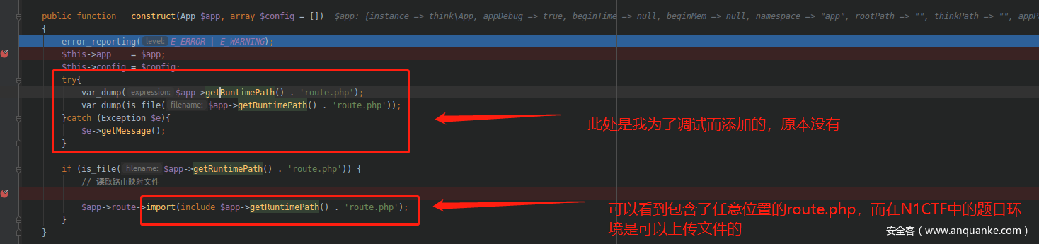 在\think\Url.php中该构造器引入了RuntimePath下的route.php文件,因为这道题是允许上传文件的,所以只要在可上传的目录下上传一个route.php的webshell即可。