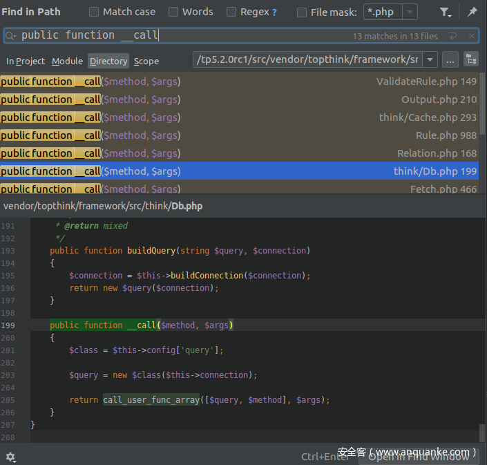 这样才可以触发__call方法,那么直接搜索关键字public function __call,因为一般PHP中的__call方法都是用来进行容错或者是动态调用,所以一般会在__call方法中使用