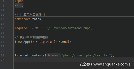 首先根据POC生成phar文件,放入public目录,在index.php中增加以下语句来触发反序列化,关于什么方法可以触发反序列化可以参考以下两篇文章,讲得很详细了,由于复现的时候题目环境已经关闭因此在这里我是自己构造的反序列化触发,预期解是通过Rogue Mysql Server让其执行LOAD DATA LOCAL INFILE语句即可触发phar反序列化。