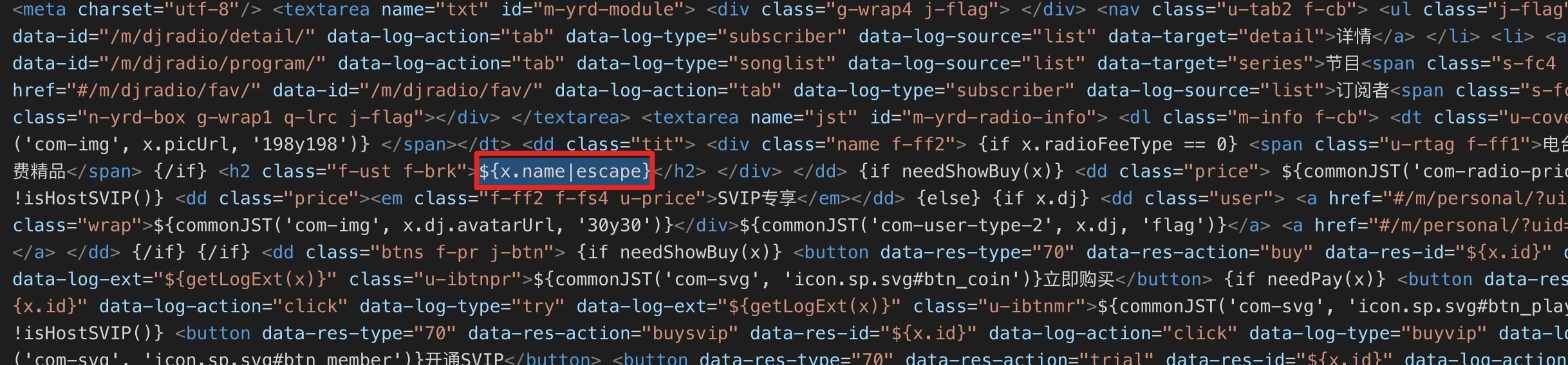 原漏洞作者的思路是从html模板文件找到未过滤的模板变量,从而控制输出点达到xss。但在实际挖掘中,大部分html输出点都是不可控的,原作者找到的xss触发点在电台页面/pub/module/main/djradio/show/index.html的电台名称字段。