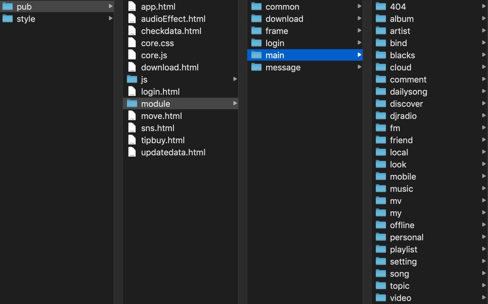 解压之后目录结构如下,包含了html、js、css文件等,正是这些构成了网易云音乐的整个前端界面。