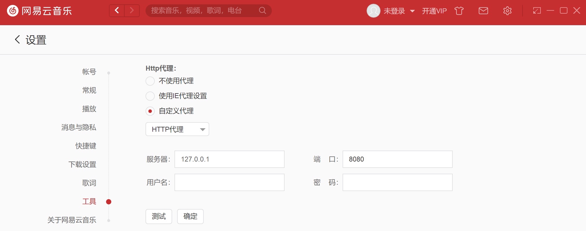 现在复测没有xss漏洞可以用,那我们就假装有一个xss,通过拦截网易云音乐的请求修改响应,插入我们的JavaScript代码。此时祭出大杀器BurpSuite,通过网易云音乐自带的HTTP代理功能设置成127.0.0.1:8080