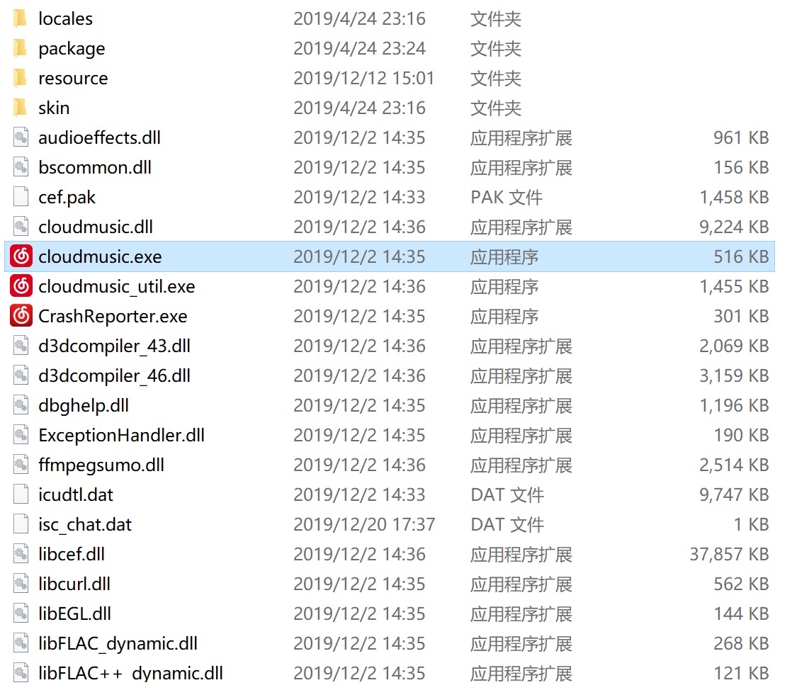 漏洞挖掘的第一步,先打开网易云音乐的目录,可以看到明显的Cef目录架构,比如说子目录、依赖库特征等。
