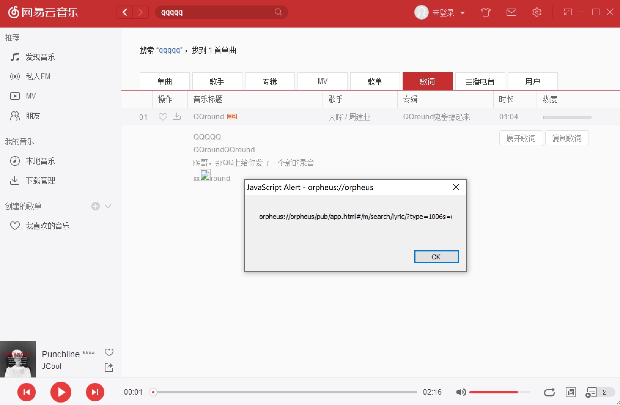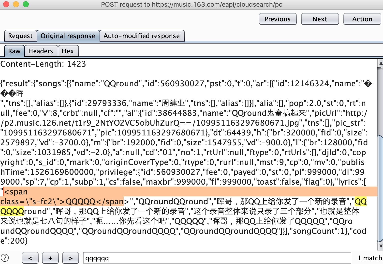 比如说在搜索歌词时,响应部分的lyrics字段会作为html内容插入到页面中,可以替换这部分的响应内容插入xss内容。