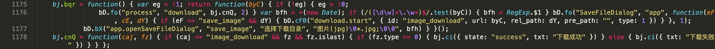 网易云音乐的主要功能逻辑在core.js文件,第一步先将混淆的JavaScript代码美化,提高代码可读性,在代码量居多的情况下可以搜索相关关键词以定位函数,如save、保存、download、下载等,通过关键词定位找到一处可疑的功能代码。