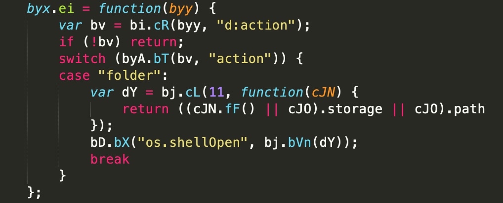 exe文件已经落地到文件系统中了,接下来就是如何触发下载后的exe文件。通读代码可以发现,网易云音乐基本是通过bD.cFB、bD.bX调用native函数,可以围绕着这些函数调用进行发掘,然后复用函数方法。