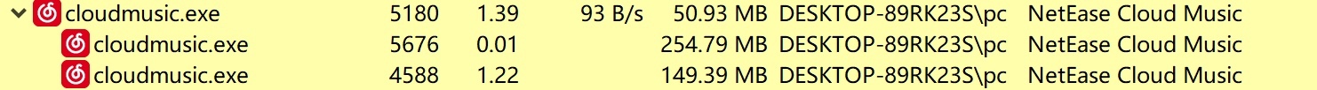 通过进程查看软件Process Hacker查看cloudmusic.exe进程,可以看到cloudmusic.exe主进程下面起了两个子进程。