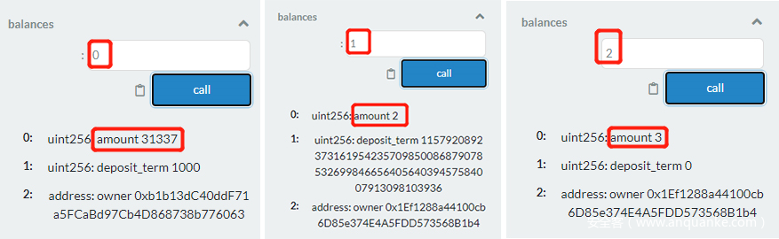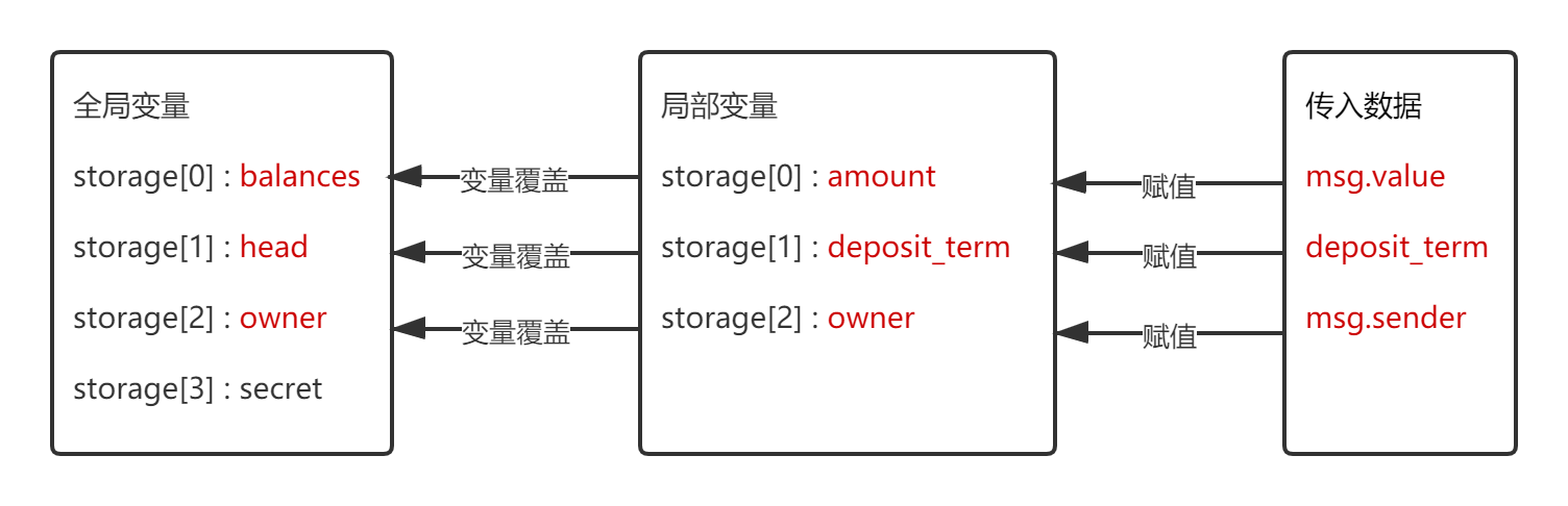 - 继续调用invest()函数传入account为2,deposit_term为0,携带的msg.value为2wei,msg.value赋值amount,再进行balances变量覆盖(由于变量循环赋值的关系),最终结果balances=amount=3;deposit_term值变量覆盖也成为head值为0,相当于还原head原始的值。