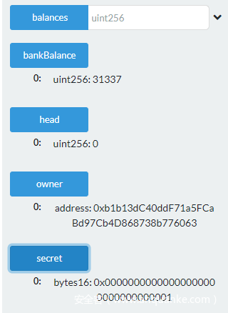 由于secret存储在storage(storage变量是指永久存储在区块链中的变量),所以我们可以调用storage索引获取里面的值。