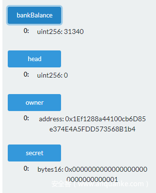 从合约源码可看到,该合约中有四个全局变量(balances,head,owner,secret),在solidity中,全局变量存储在storage当中,对于复杂的数据类型,比如array(数组)和struct(结构体),在函数中作为局部变量时,也会默认储存在storage当中。并且solidity的状态变量存储时,都是按照状态在合约中的先后顺序进行依次存储。