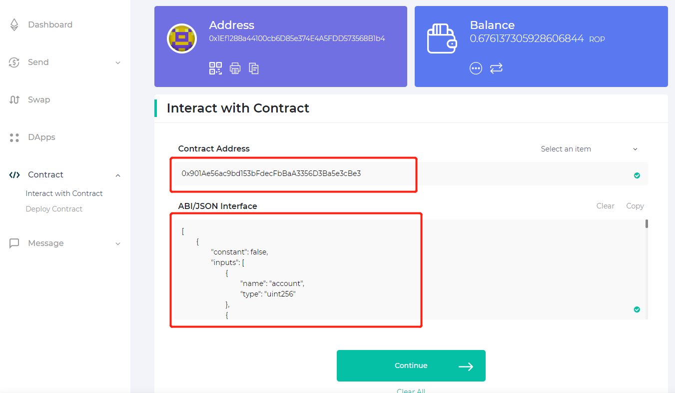 在remix中获取api并复制部署的合约地址,填入myetherwallet钱包中。
