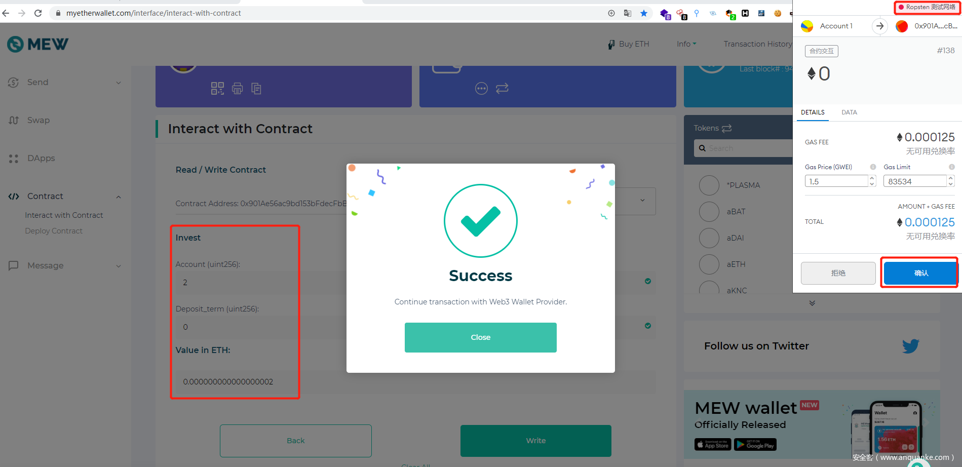 本次攻击演示在ropsten测试网进行,使用工具为Remix+Matemask+myetherwallet