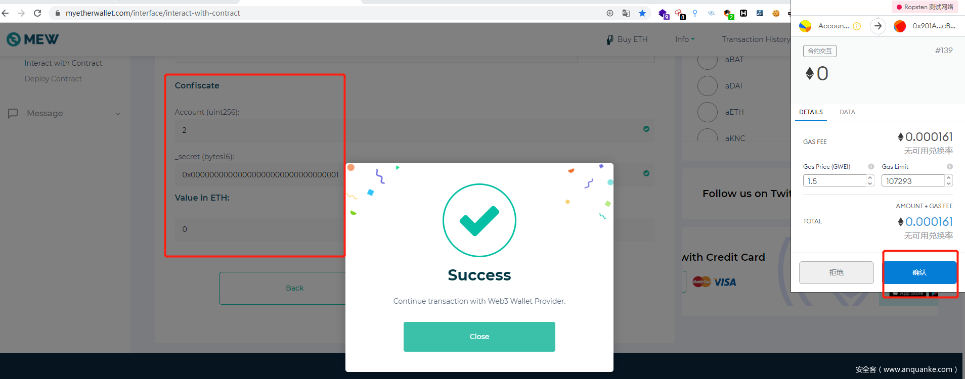 - 调用confiscate()函数传入两个参数:account为1,secret值为我们之后通过storage获取的密码值,最终取走合约所有的余额。