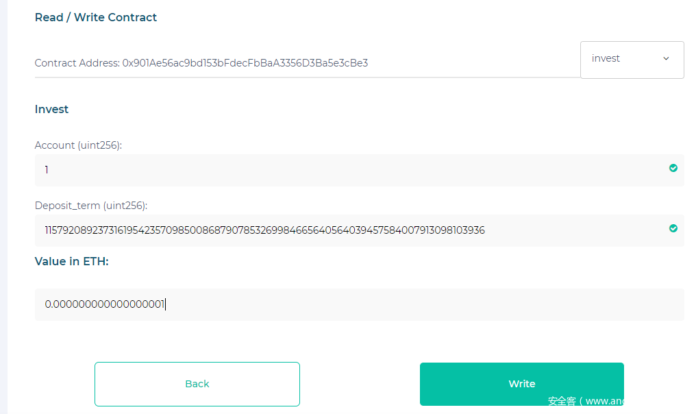 我们继续来分析合约漏洞,由于上图invest()函数中赋值的三个变量(msg.value,deposit_term,msg.sender)都可控: