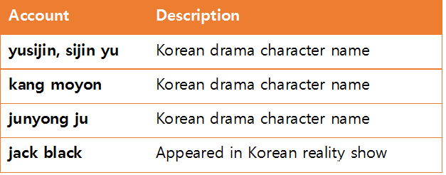 这个活动背后的团队非常熟悉韩国文化、电视节目、戏剧和语言,因为与云服务相关的帐户名称来自韩国的戏剧和电视节目,主要包括以下: