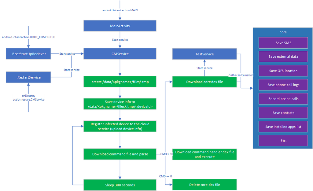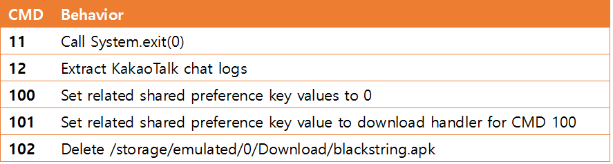 从云端接收到的命令代码处理程序(CMD值)作为单独的dex文件实现,它是在恶意软件解析命令文件之前或之后下载的。 这种机制允许攻击者轻松扩展其恶意功能,而无需更新整个恶意软件。