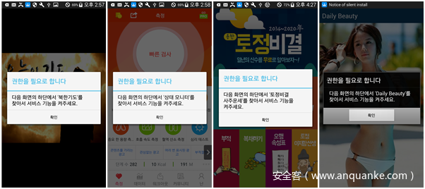 当执行dropper APK时,它首先会检查设备是否已经被感染, 如果没有被感染,它会打开Accessibility(辅助功能)权限,如果受害者点击该弹出式窗口,界面就会变成“辅助功能”的设置菜单,以便应用程序可以获得该权限。