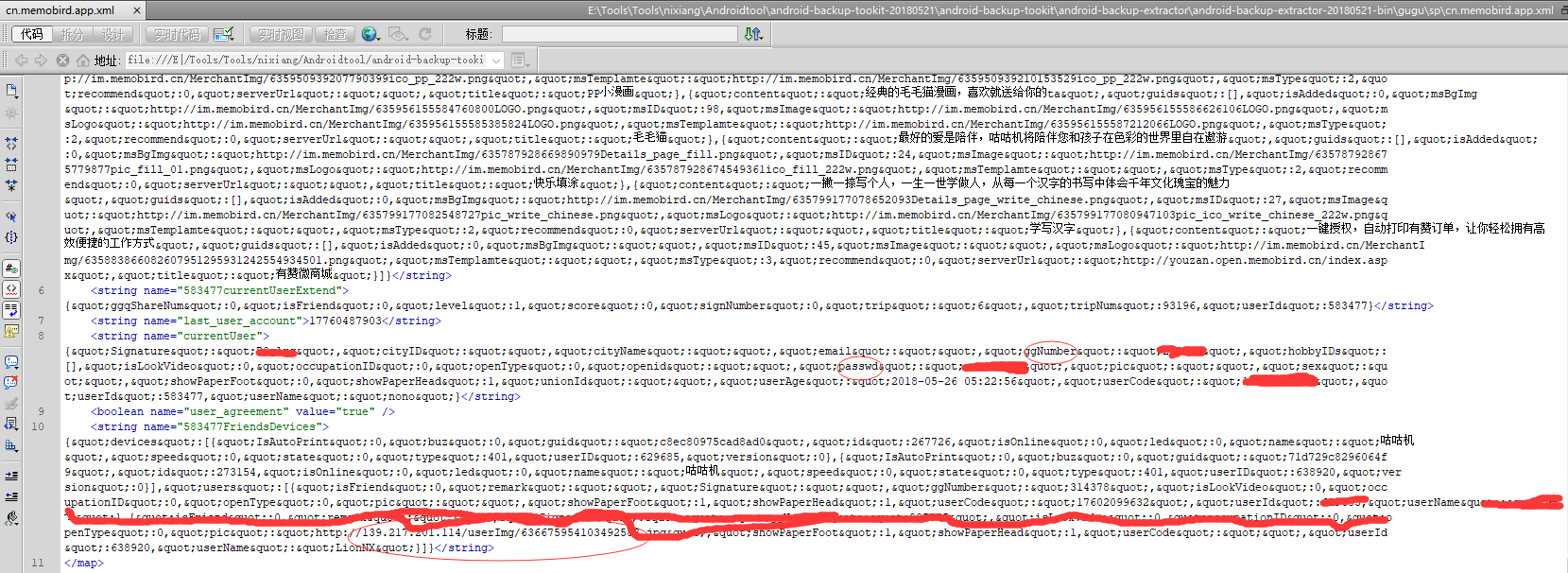 尝试:我们学校的APP存在此配置问题,会导致学生身份证,学号等泄露。亦可以尝试一些租房APP,可能会有更多泄露。下图是咕咕机APP中备份文件中暴露的用户名和密码。