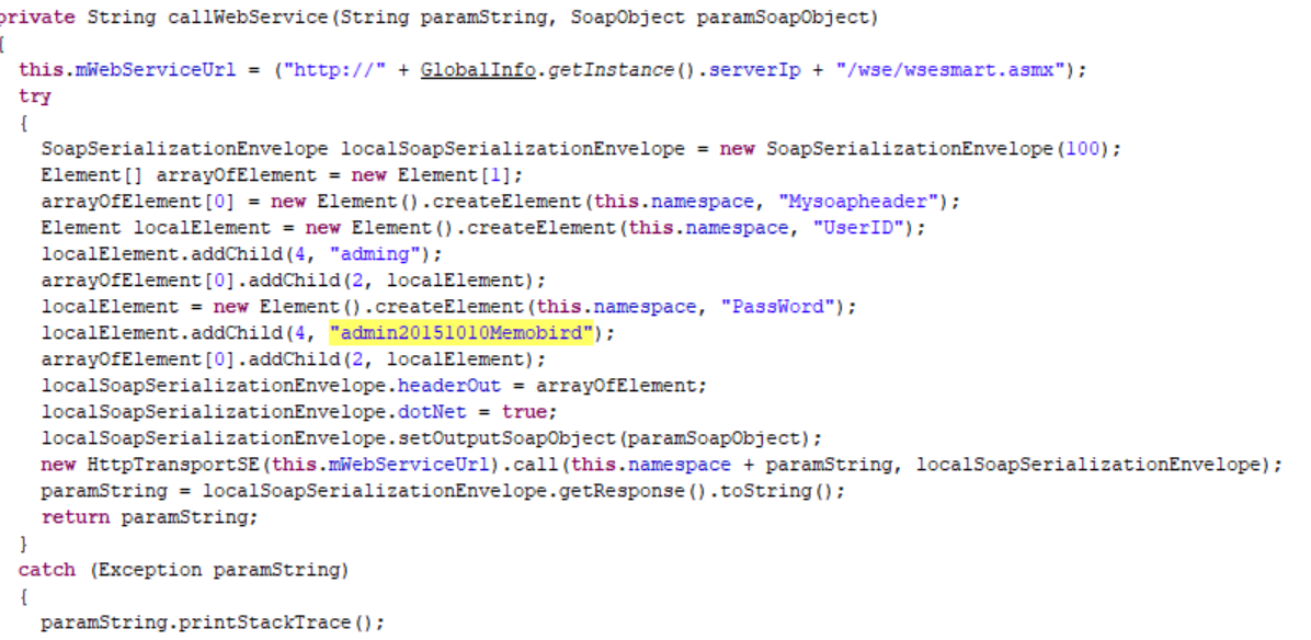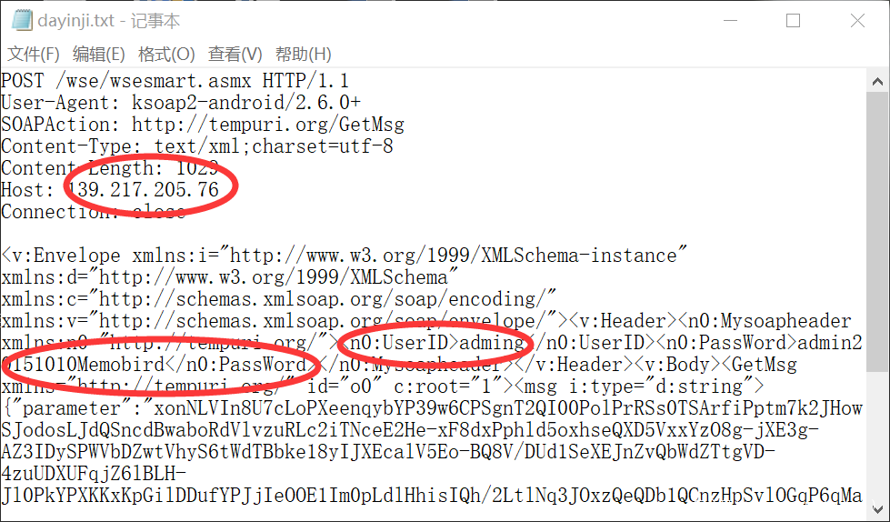 抓包过程中发现了服务器ip,发现一个明文传输的用户名和密码(这个在后期的收集中经常出现),是个SOAP协议,但是构造注入并未成功。经过跟官方的交流,得知这webservice通过和客户端进行认证的,但是泄露了也不会造成很大危害,因为他进行了二次加密。这或许也印证了我为什么构造注入会不成功。