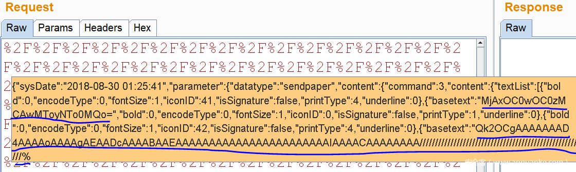 不管是本地模式还是云端模式,可做中间人攻击来截获打印内容。这里我是用手机转代理到电脑上,拦截了数据包。发现传输的时间和传输的内容都以base64方式进行编码,并未进行复杂的加密。