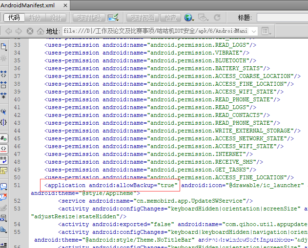 找“摘要”:AndroidManifest.xml中包含了APP的配置、包名、入口。从这里可以对整个APP框架大概了解,其中可以发现adb backup等风险配置。
