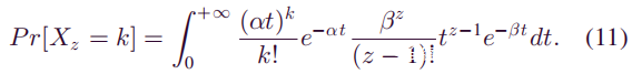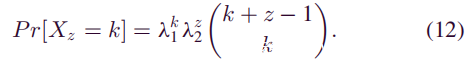 函数Pr[Xz = k]不是泊松分布,挖掘一个块所花费的时间是无记忆的,并且总的挖掘时间具有伽马分布,因此泊松分布系数中的时间变量t是具有伽马分布而不是期望值的随机变量。根据概率公式,分布函数可以表示为: