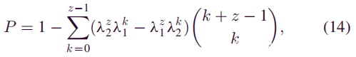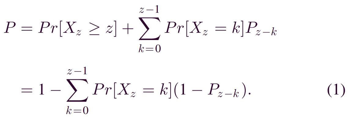 首先考虑以下两种情况,攻击者会成功进行双花。一种是攻击者以采矿速度α开采大于或等于S’z内诚实矿工开采的z区块的区块。在这种情况下,攻击者追上了主链。另一种情况是,攻击者在S’z内挖掘了k个区块,并且他也有机会以概率Pz-k赶上差距z-k。通过总结这两种情况,可以获得拟议的攻击成功的概率P: