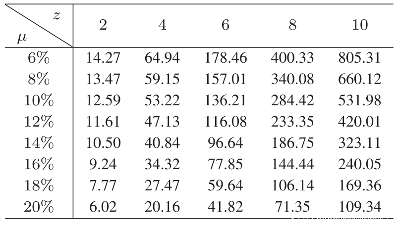通过计算(20)可以得出攻击者在q = 0.25时随着μ和z的增加而达到的盈亏平衡点。设置变量的范围,以使块数z从2到10,步长为2,并且Sybil节点的比率μ从6到20%,步长为0.02,收支平衡点的不同结果显示在下表中。