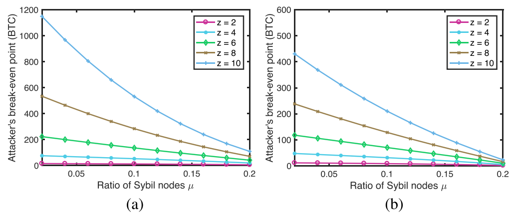从表中可以轻松地发现,在Sybil节点μ的任何比率下,盈亏平衡点都随着z的增长而急剧增加。下图(a)和(b)在q = 0.25和q = 0.3的情况下更直观地表明了这一变化。显然,商家花费在等待确认上的时间越长,成功攻击的可能性就越低。此外,下图还说明了在任何z下,盈亏平衡点随着μ和q的增长而稳定下降。通常,与不使用Sybil攻击的情况相比,攻击者通过部署多个Sybil节点更容易获利。