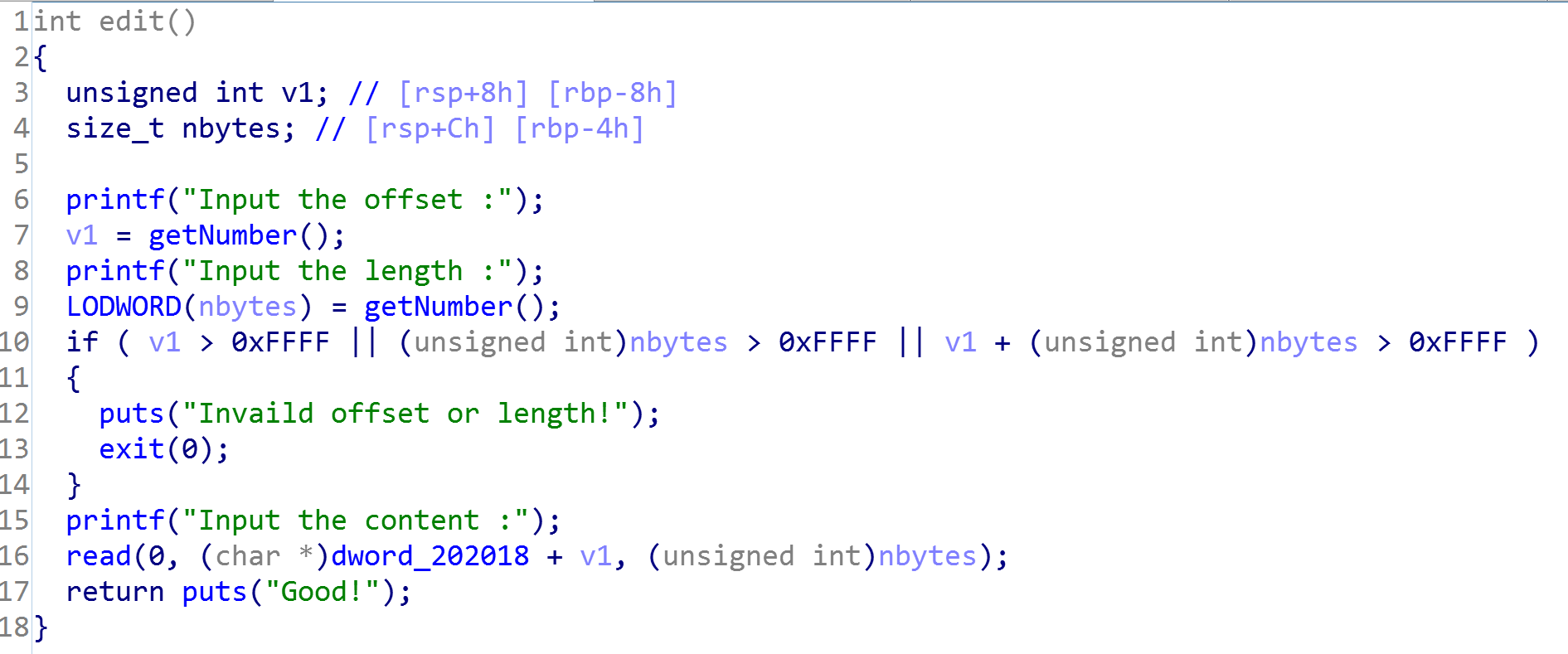 由于size是个有符号数,为0的话减一恒比无符号数大,那么就可以无限溢出了。有了堆溢出,就好办了。