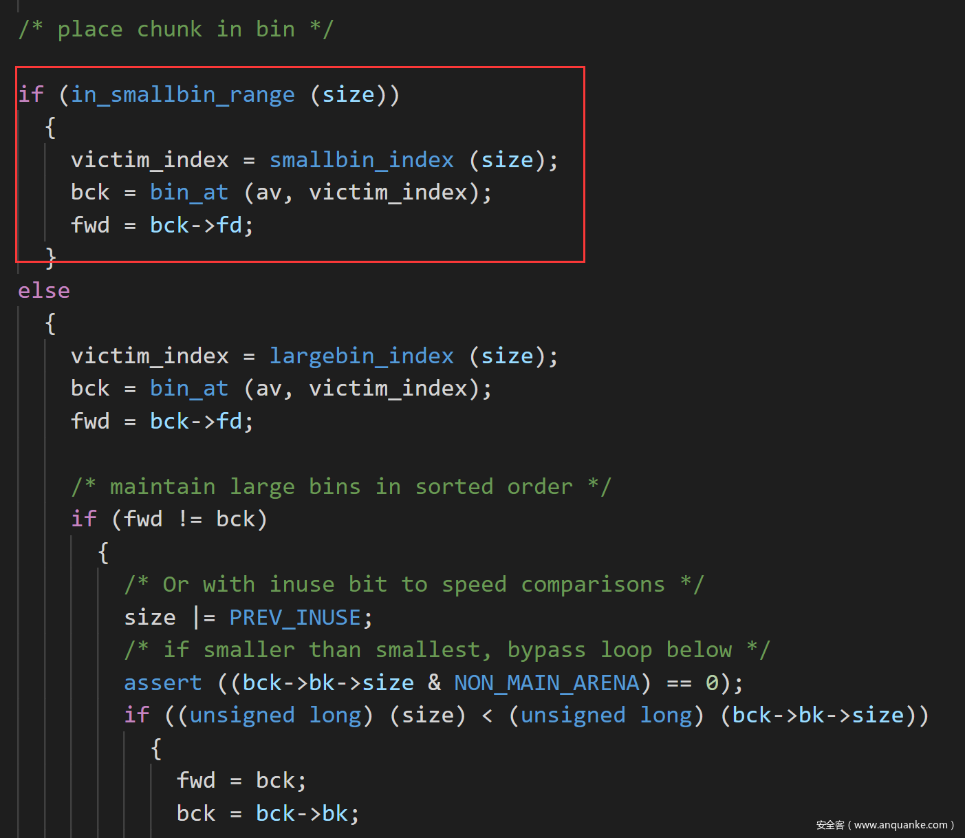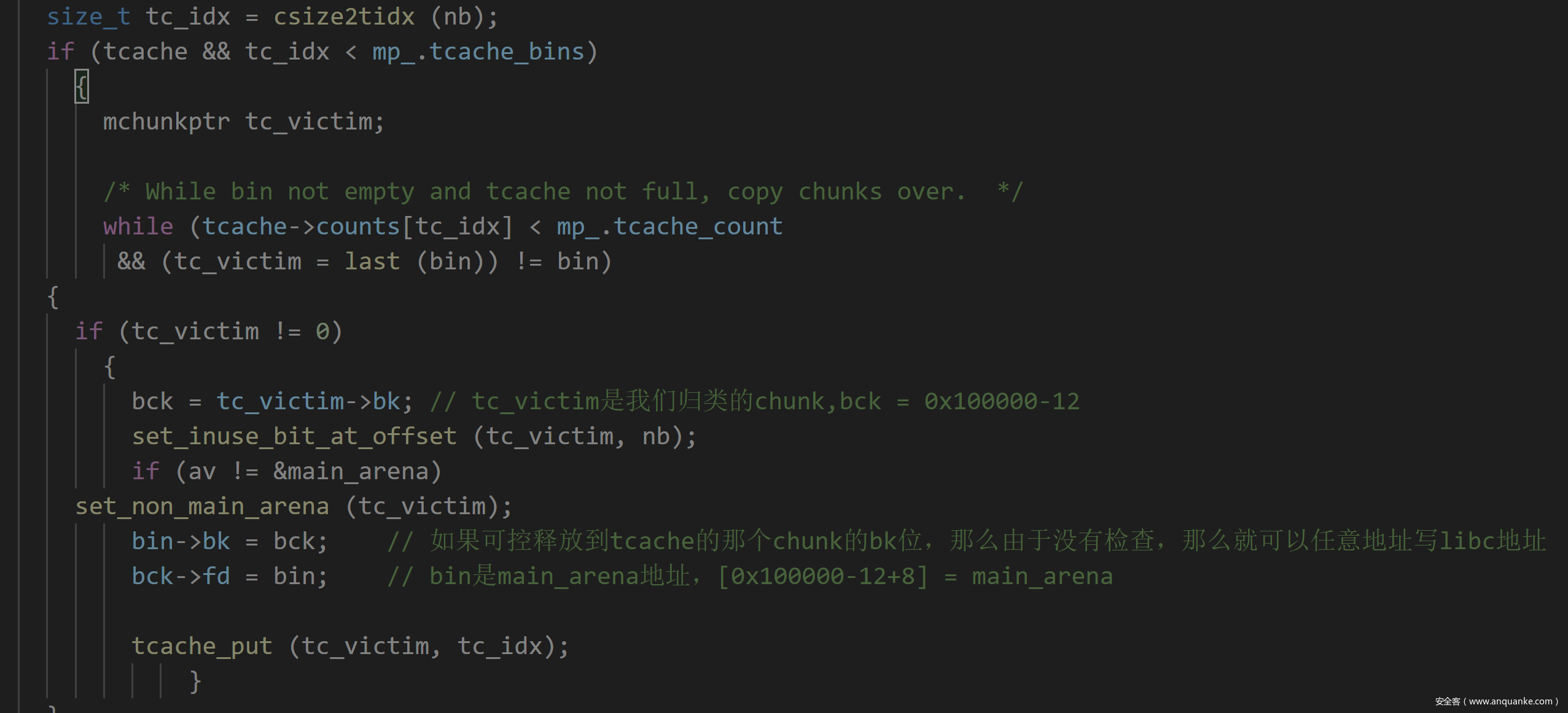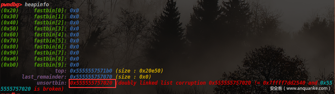 所以第一次会绕过合法性检查,成功的将0x60的chunk从unsorted bin取出放到smallbin中,这也就同时完成了创造0x60的smallbin和unsorted bin attack两个目的了,也就是一石二鸟了。