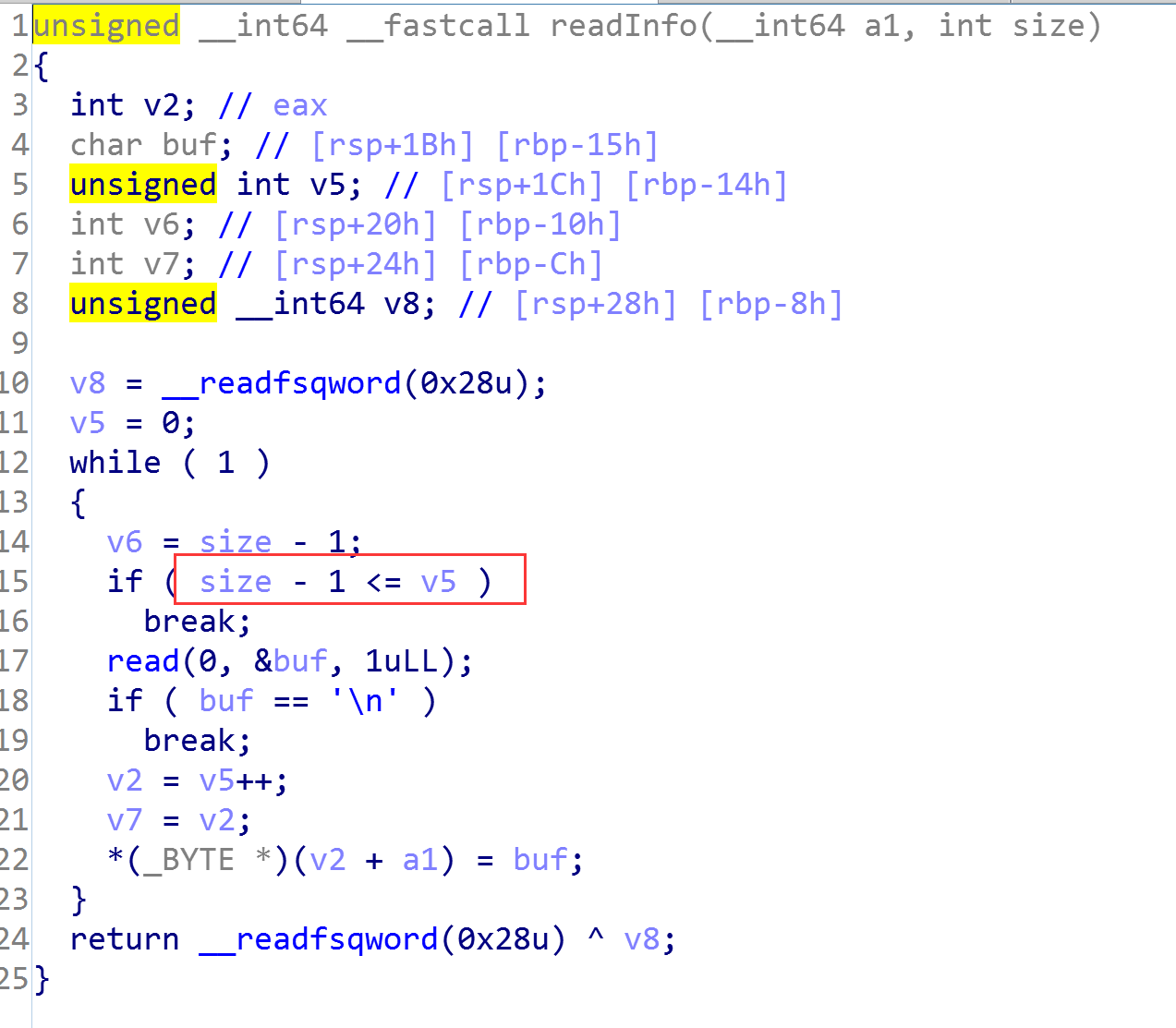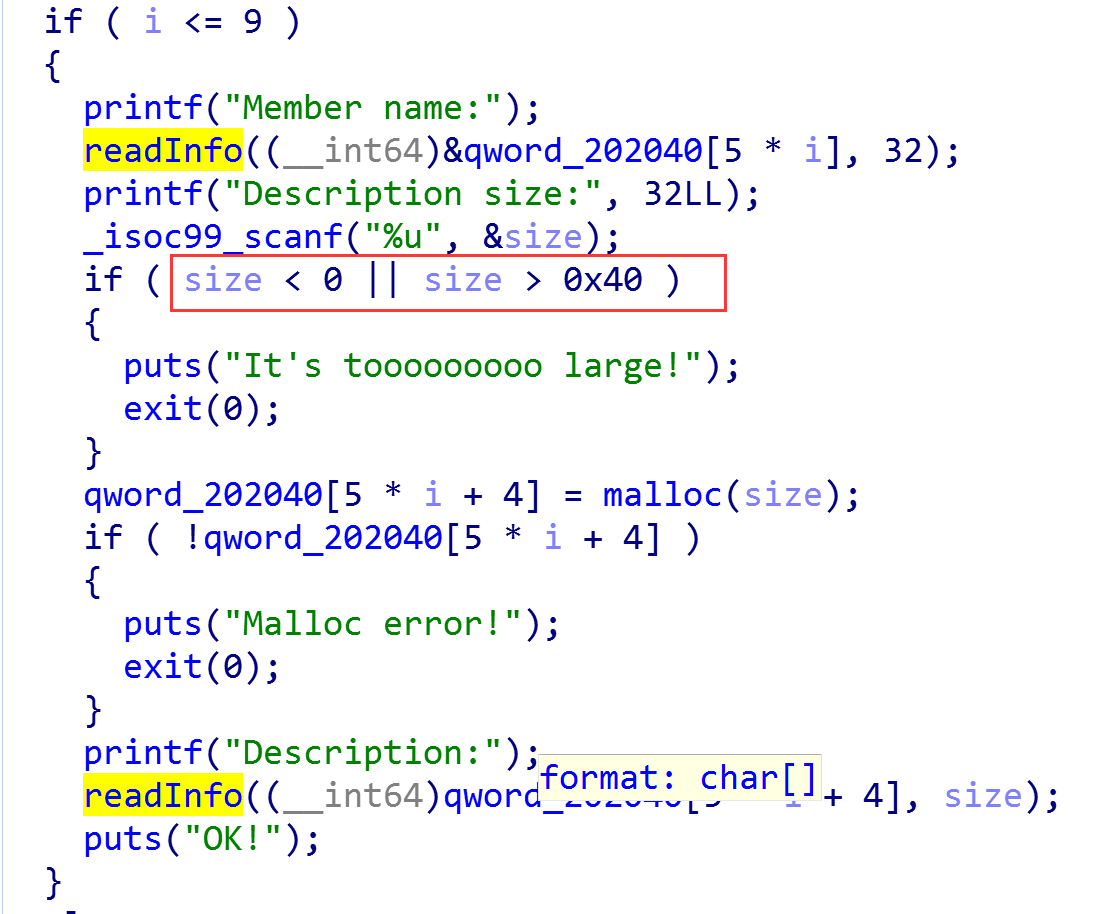 如果size输入0,那么就会绕过判断,同时会分配0x20 size的chunk,但是继续看readInfo功能: