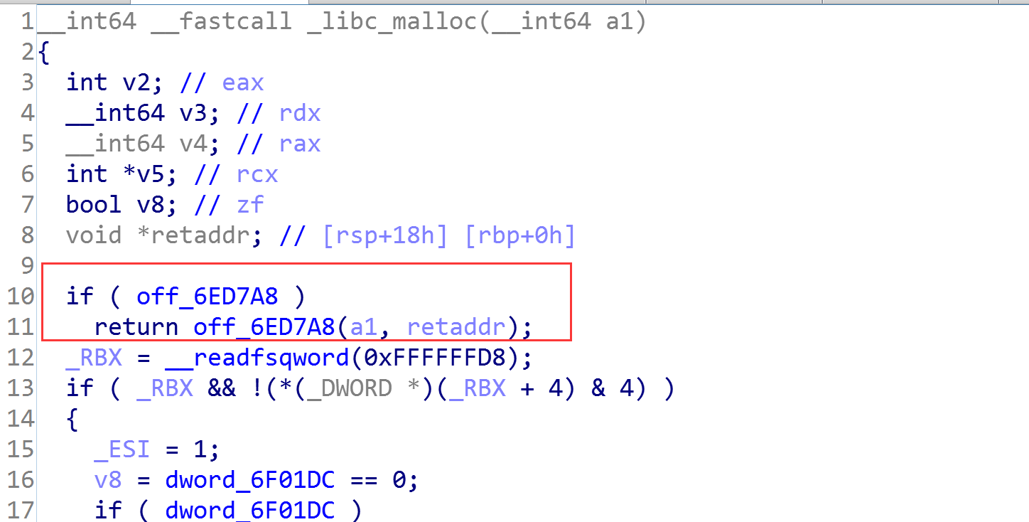 在_libc_malloc中自然会有查看hook不为空就调用的操作: