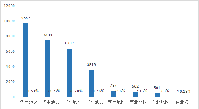 金融类App遍布全国各地,有30179款可以根据区域划分规则明确归属地,下列区域分布仅基于这30179款做分析。从大区来看,华南地区App产量位居第一,占App总量的31.53%;其次是华中地区,占总量的24.22%;华北地区位列第三,占总量的20.78%。详见图列: